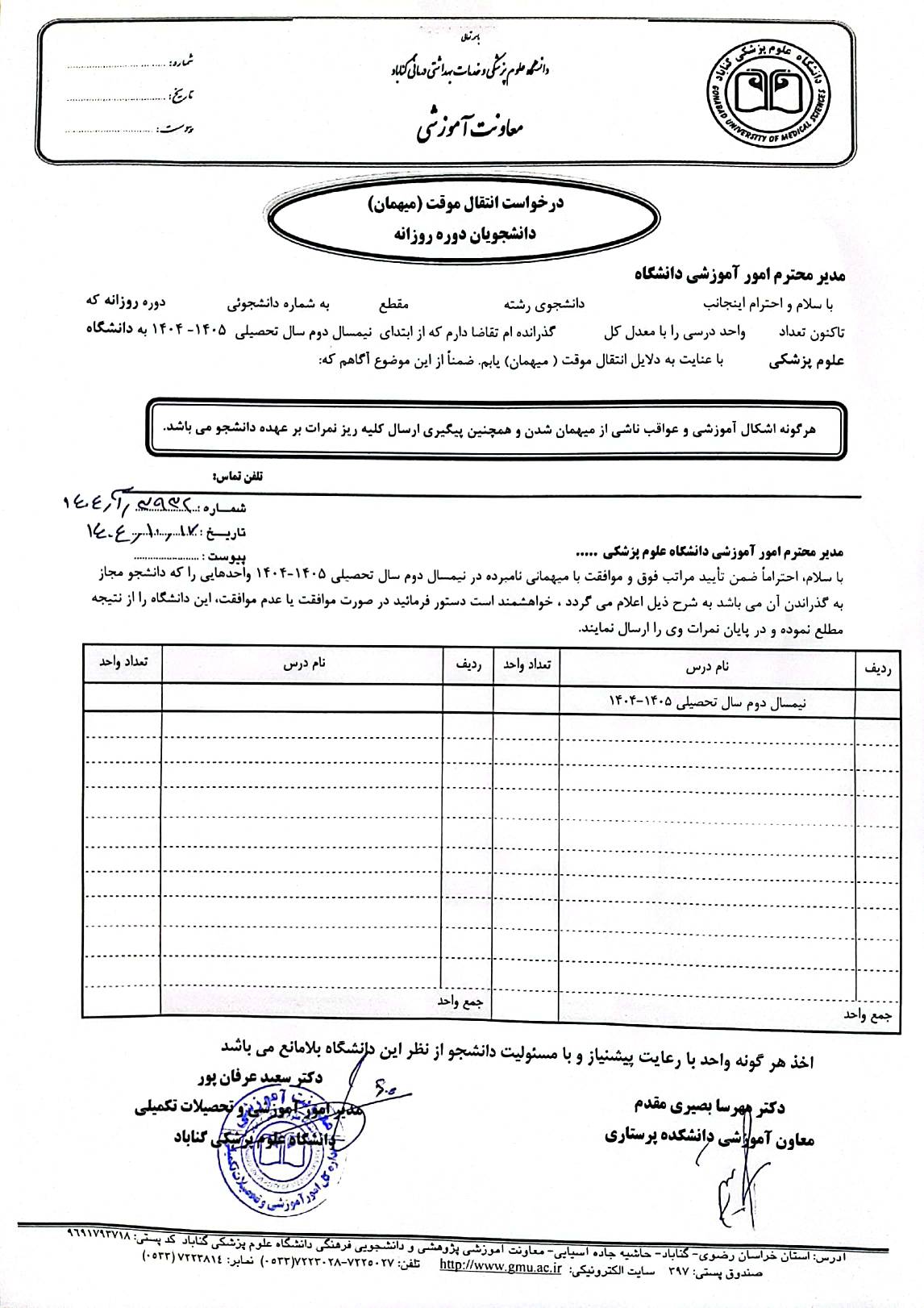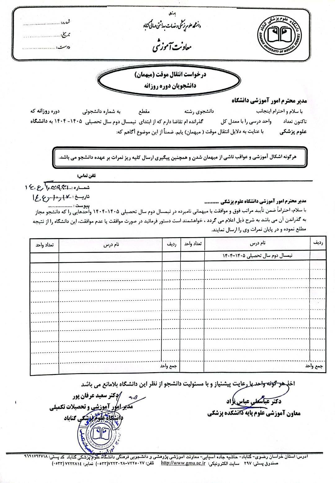 به اطلاع دانشجویان محترم می رساند، جهت انجام فرایند مربوط به میهمانی نیمسال دوم 1405-1404 لازم است نسبت به تکمیل فرم موافقت با میهمانی که در وب سایت دانشگاه بارگذاری شده است اقدام فرمایید. پس از تکمیل فرم مذکور آن را در سامانه میهمانی بارگذاری نمایید .