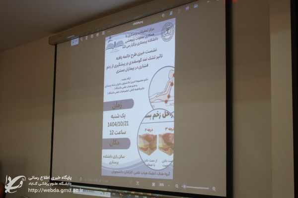 نشست خبری با عنوان «تأثیر تشک نمد گوسفندی بر پیشگیری از زخم فشاری در بیماران بستری» در سالن حکیم جرجانی کتابخانه دانشگاه با حضور خانم امیری و خانم کاملی، مجریان طرح، برگزار شد.