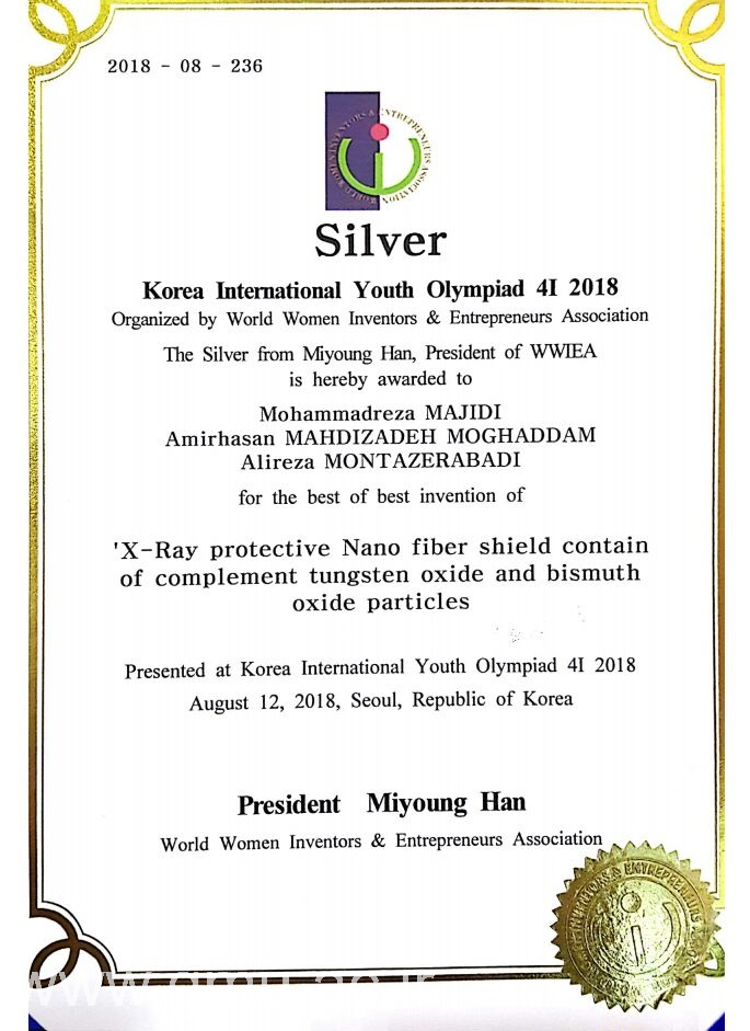 - 🥈 Silver Medal at the Korea International Youth Olympiad (KIYO 4i) 2018, Seoul, South Korea — for the invention: “X‑Ray Protective Nano Fiber Shield containing Complement Tungsten Oxide and Bismuth Oxide Particles”.
